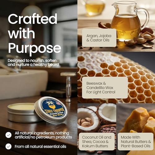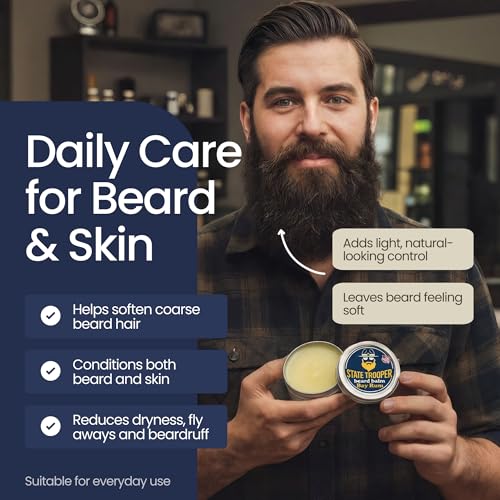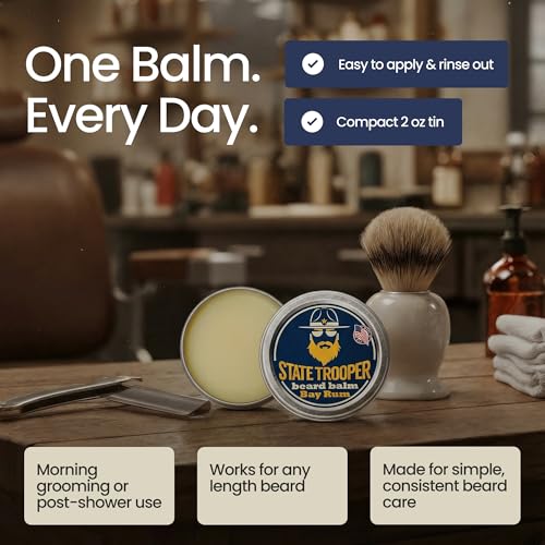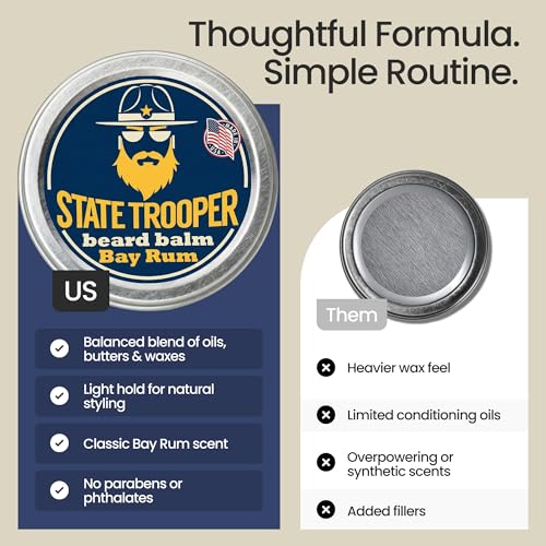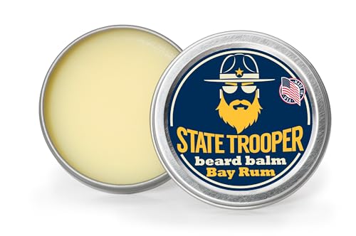 State Trooper Beard Balm (2 oz Tin) – All Natural Leave-In Beard Conditioner & Softener for Men – Bay Rum – Infused with Shea Butter, Argan & Jojoba Oils for Healthy, Tamed Beards