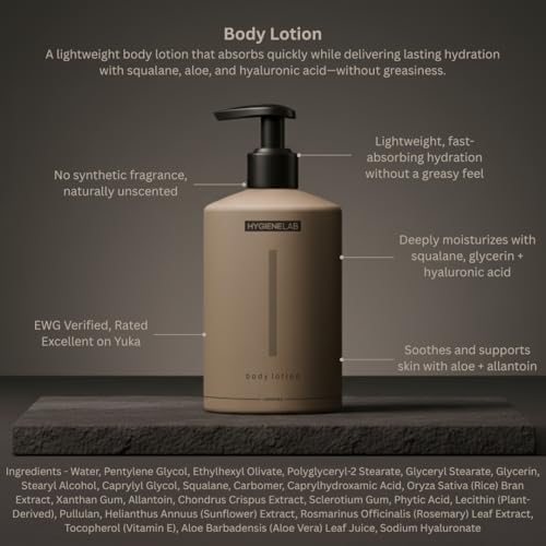 HygieneLab Body Lotion for Men – EWG Verified, Ultra Hydrating, Non-Toxic, Fast-Absorbing, Fragrance-Free, Unscented, Paraben-Free, Sulfate-Free, Daily body lotion for Dry Skin & Sensitive Skin, 12oz